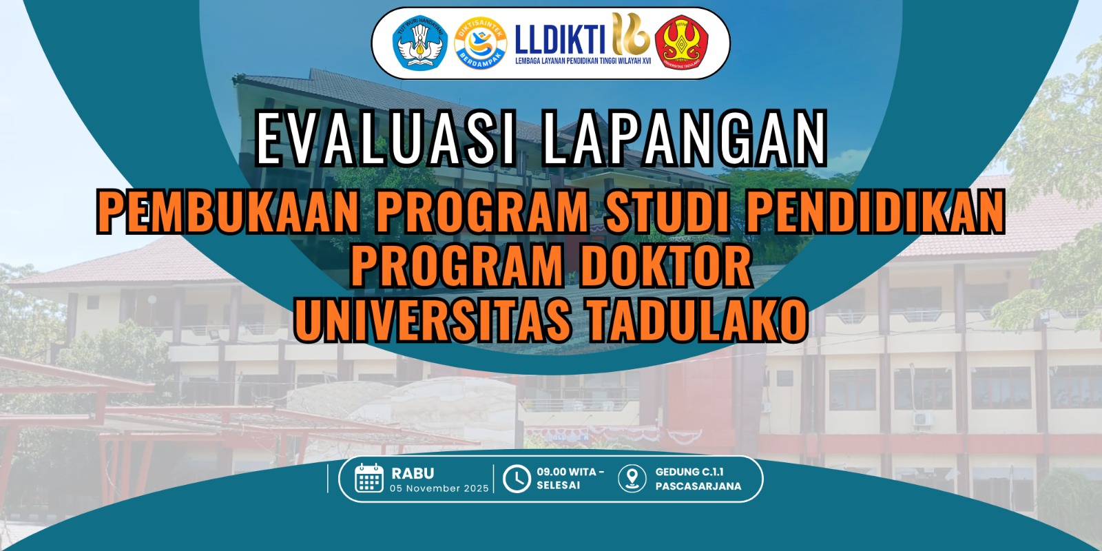 Universitas Tadulako pada tanggal 5 November 2025 telah menyelenggarakan kegiatan Evaluasi Lapangan Pembukaan Program Studi S3 Pendidikan. Kegiatan ini merupakan salah satu tahapan penting dalam proses pembukaan Program Studi S3 Pendidikan. Dipimpin Tim Penyusun diketuai oleh Prof. Konder Manurung, DEA., Ph.D., menjelaskan, proses ini sebagai bagian dalam menjadikan Universitas Tadulako sebagai pusat unggulan pendidikan di tingkat doktoral dengan memperluas jenjang akademik dan meningkatkan mutu pendidikan pascasarjana.